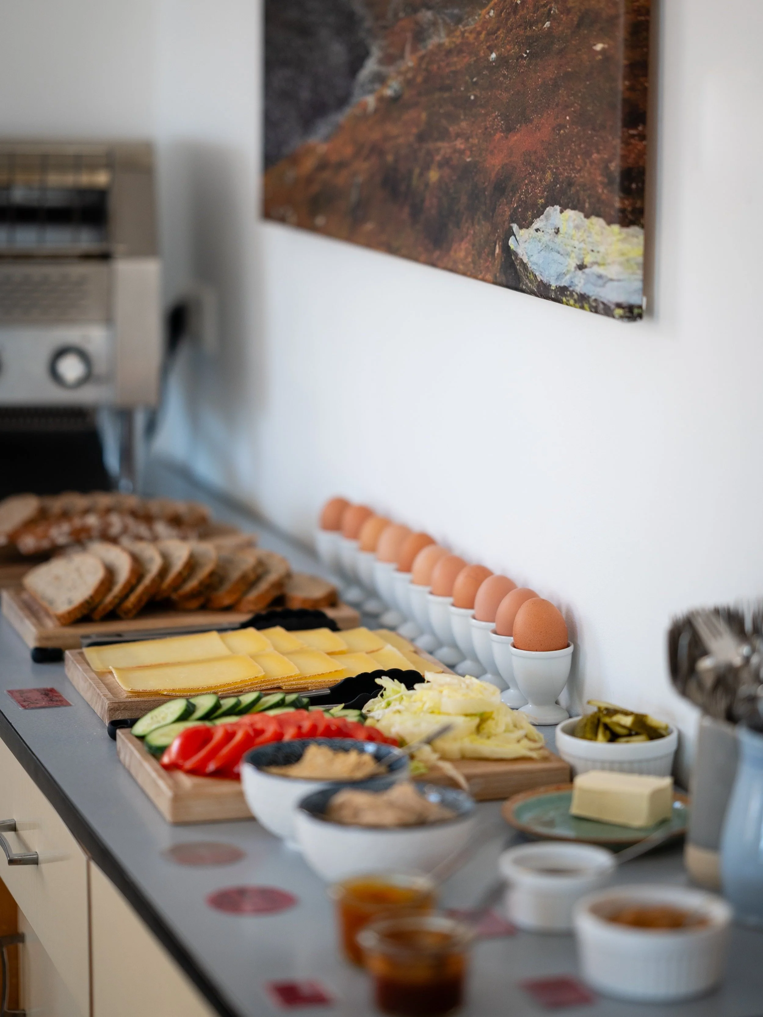 After yoga, head straight downstairs for a hearty breakfast spread. There are plenty of options for everyone: yogurt with a variety of toppings, fresh bread, eggs, vegetables, cheese, jams, coffee, and more. You are welcome to pack a lunch or a snack from the spread. MoaAlm has Tupperware and paper bags available.